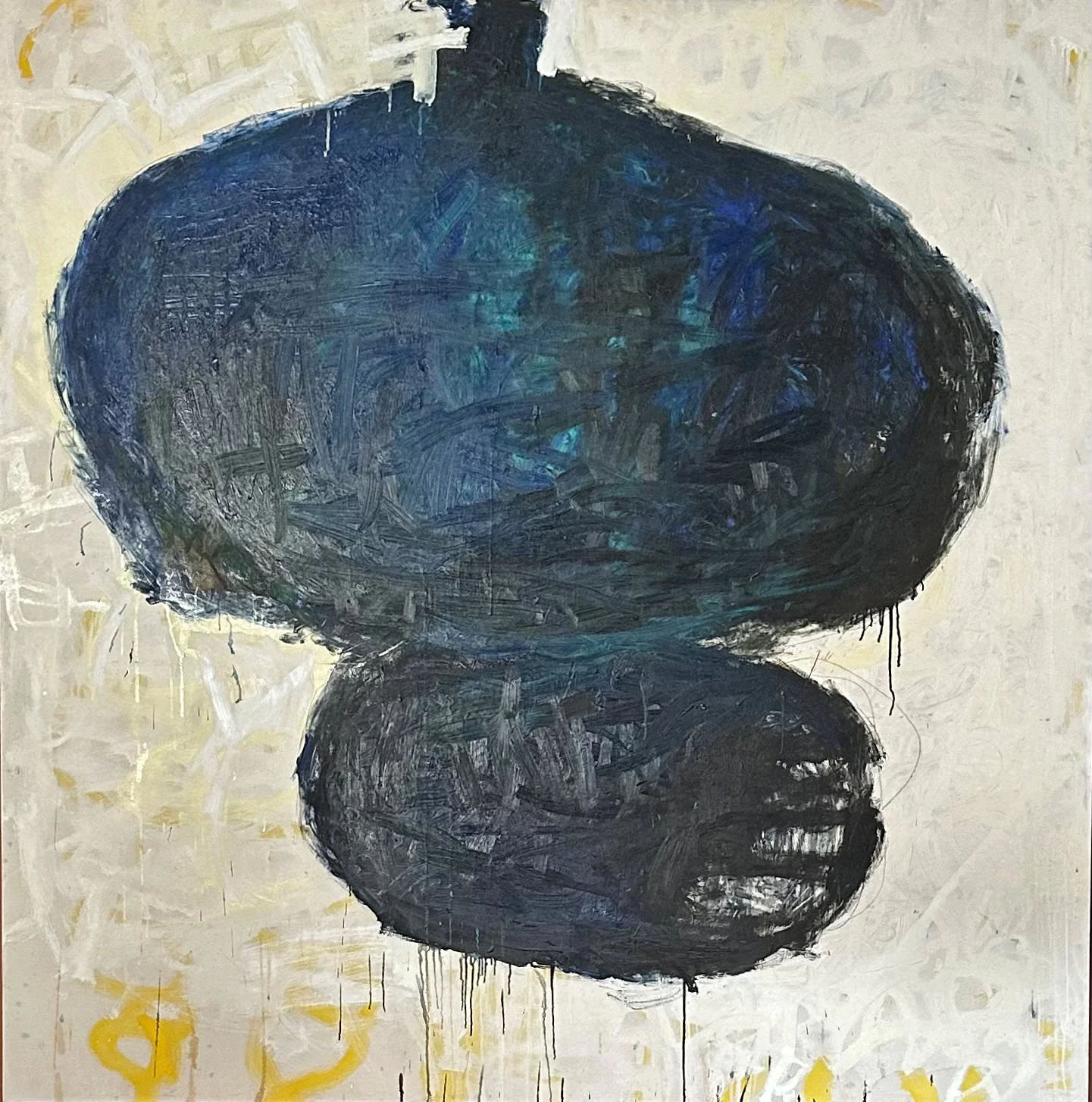 This powerful work by American painter Melinda Stickney-Gibson immediately caught my attention. I’ll admit that its commanding size (178 cm square/70” square) was a motivating factor. Plus I’m partial to blue. I was also fascinated by the many paint drips reflecting the creative process. But mostly, it was its enigmatic central figure: Was it an atomic mushroom cloud?