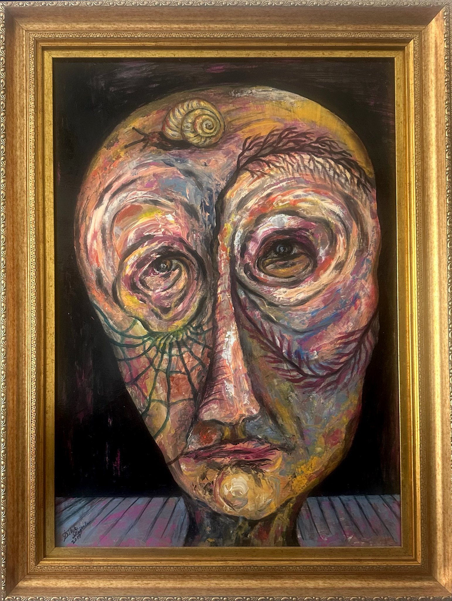 When creating an abstract painting, I normally try to put my own thoughts and feelings aside. However, when I portray a figure, I try to conjure up my own memories and feelings to accurately depict its emotions. Nature is the source of my inspiration. A snail, a spider web, and some plants are on the woman’s face. She is missing nature. She is indoors. She’s lonely and has no outside friends.