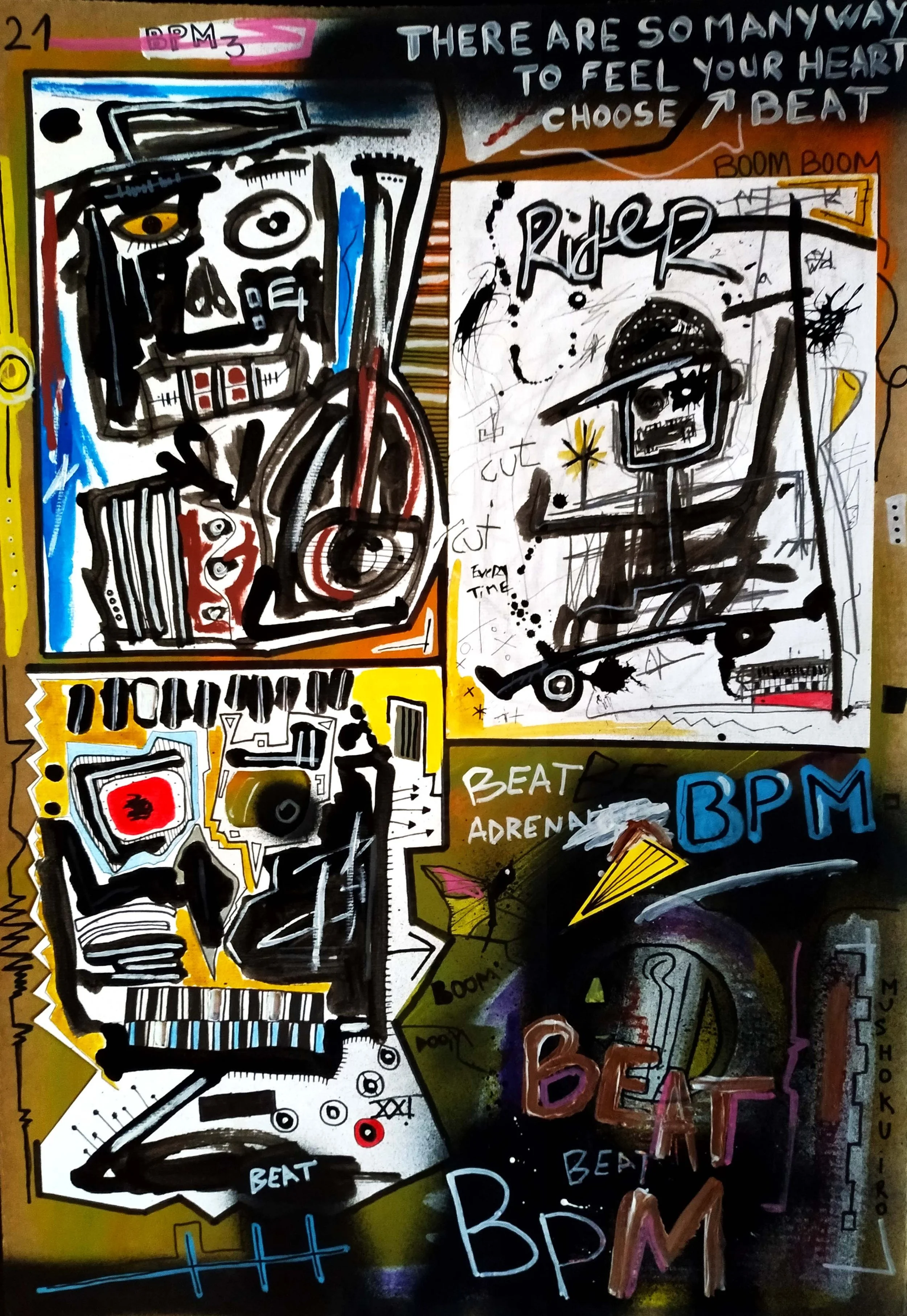 “BPM”—shorthand for Beats per Minute—alludes to the visceral energy embodied in the paintings of Guadeloupean artist Iro Mushoku. A dynamic mash up of image, text, and Caribbean colors, Iro’s work reflects his multiple passions: music, bodyboarding, and personal wellness. Visually dense creations pull viewers in with an exuberant mix of sunshine, urban grit, graffiti, and portrait-like figures that stare back at you with wide open eyes and grimacing smiles. Think the neo-Expressionism of American legend Jean-Michel Basquiat reinterpreted and transported to Caribbean-and-continental France. Then think again.