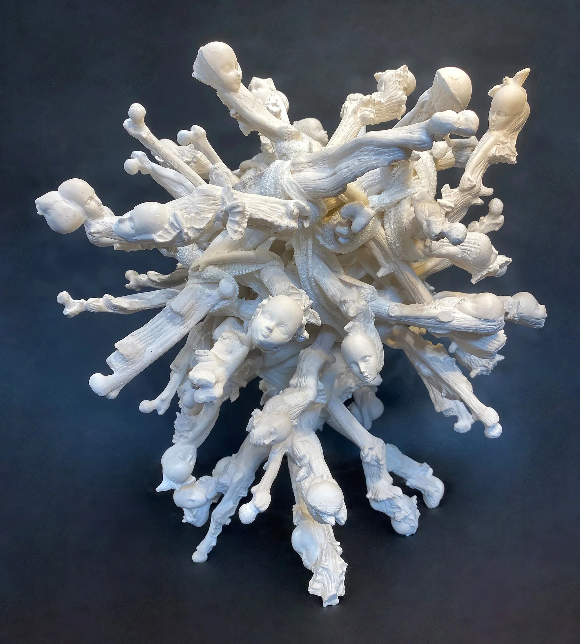 English physician-turned-artist Sally de Courcy casts a variety of conceptually linked objects (including human bones) to create powerful abstract sculptures whose geometric repetition and kinetic unity express a spectrum of human experiences and ordeals. The abstract, however, intersects with the personal—whether recalling her days as a young doctor working in a refugee camp, surviving medical isolation during recent COVID-19 lockdowns, or expressing outrage at her country’s current refugee crisis. Seemingly decorative, Sally’s sculptures hide darker and often sinister subjects that when revealed create dissonance.
