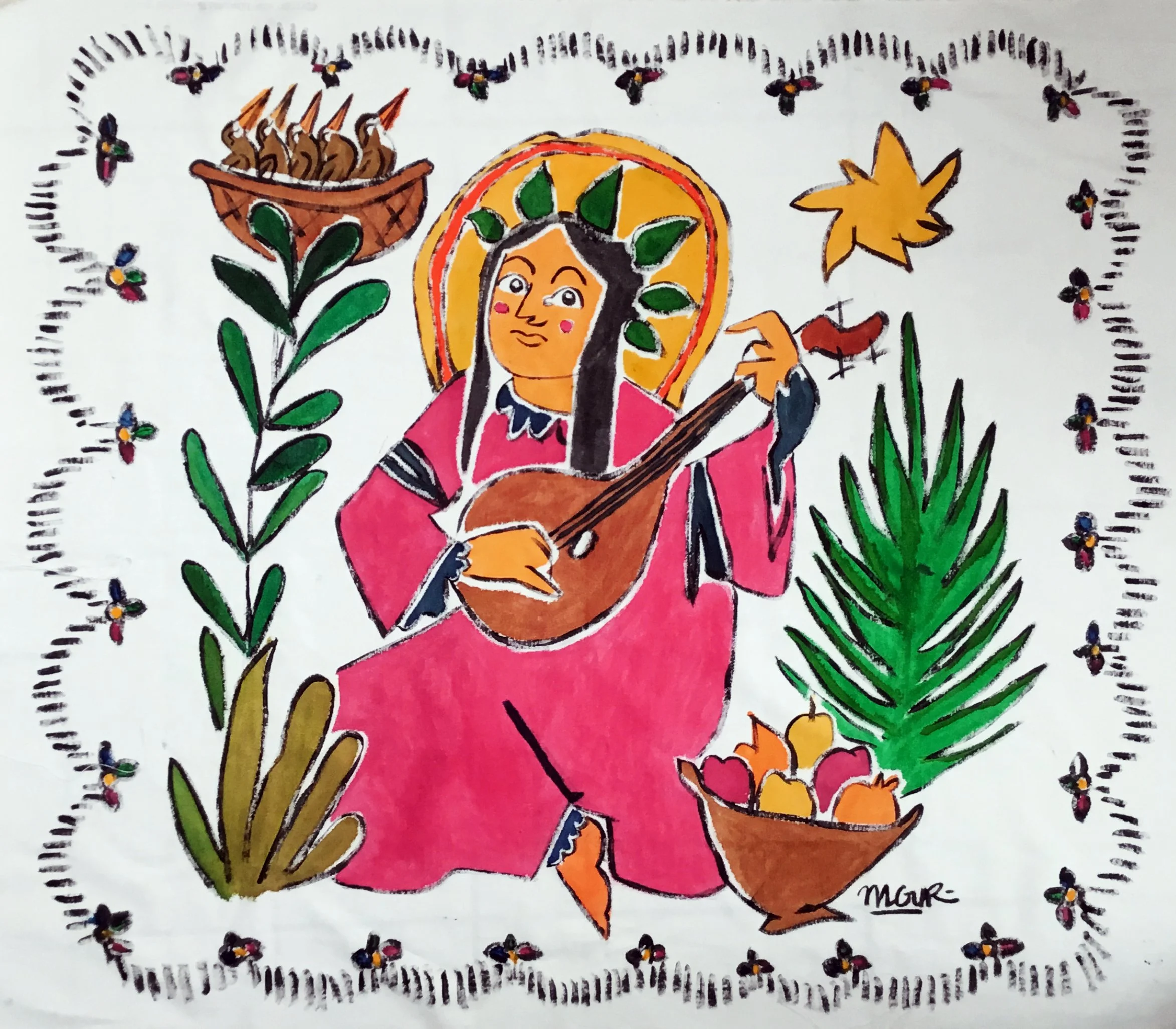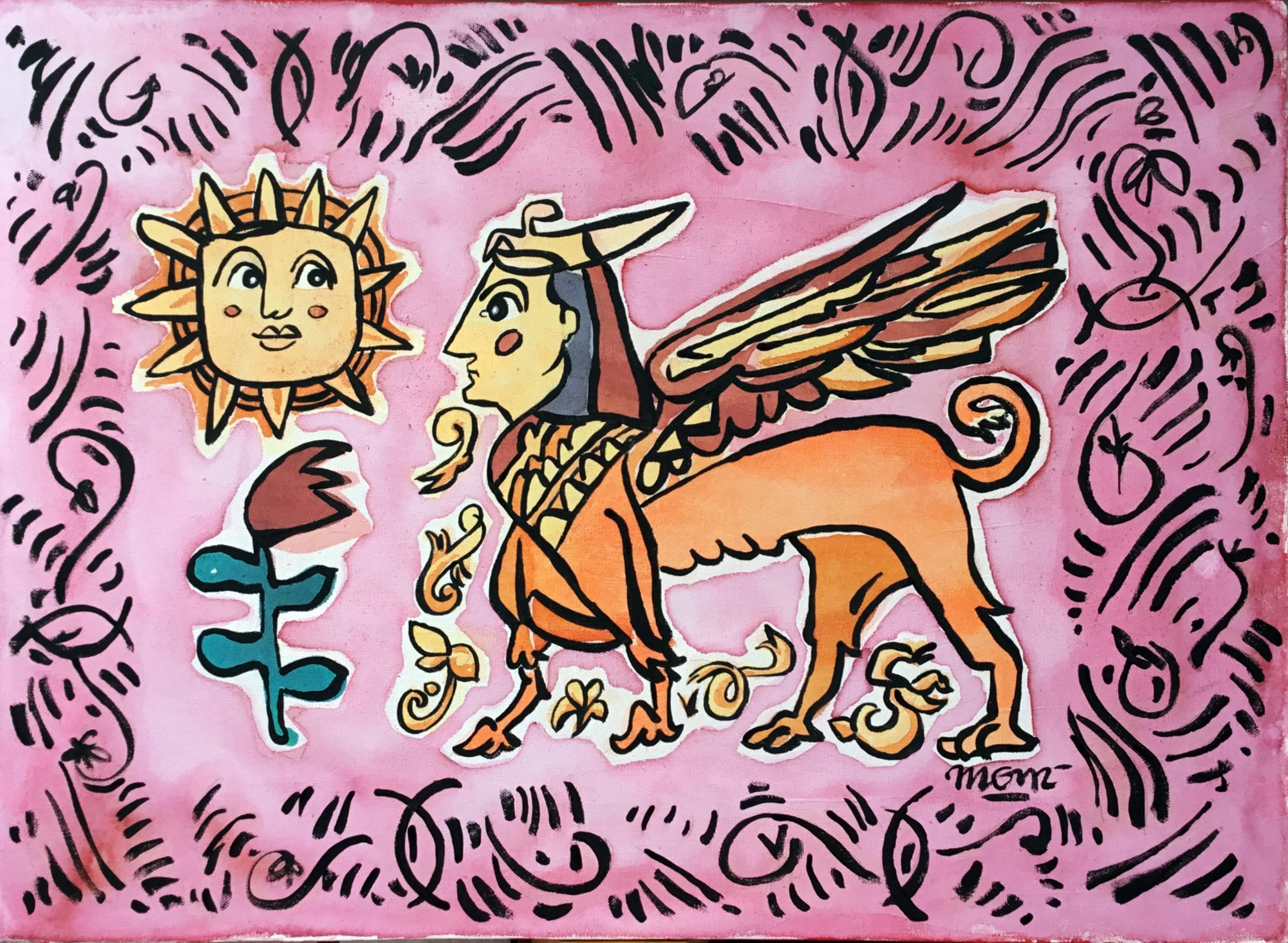 Like a modern-day Scheherazade, Turkish artist Ayhan Algur’s mission is to engage his audience in order to preserve a life. For Scheherazade, that life was her own. For Ayhan, it’s the memory of the glorious accomplishments of past Anatolian and Middle East civilizations. Taking inspiration from Arab, Byzantine, Ottoman, Persian, and Seljuk ceramics, tiles, and miniature paintings, he creates his own visual style in a variety of mediums. Ayhan places his interpretations of centuries-old figures and scenarios on canvas, fabric, ceramic plates, and jugs. Each is accompanied by a historical comment that the piece evoked in him.