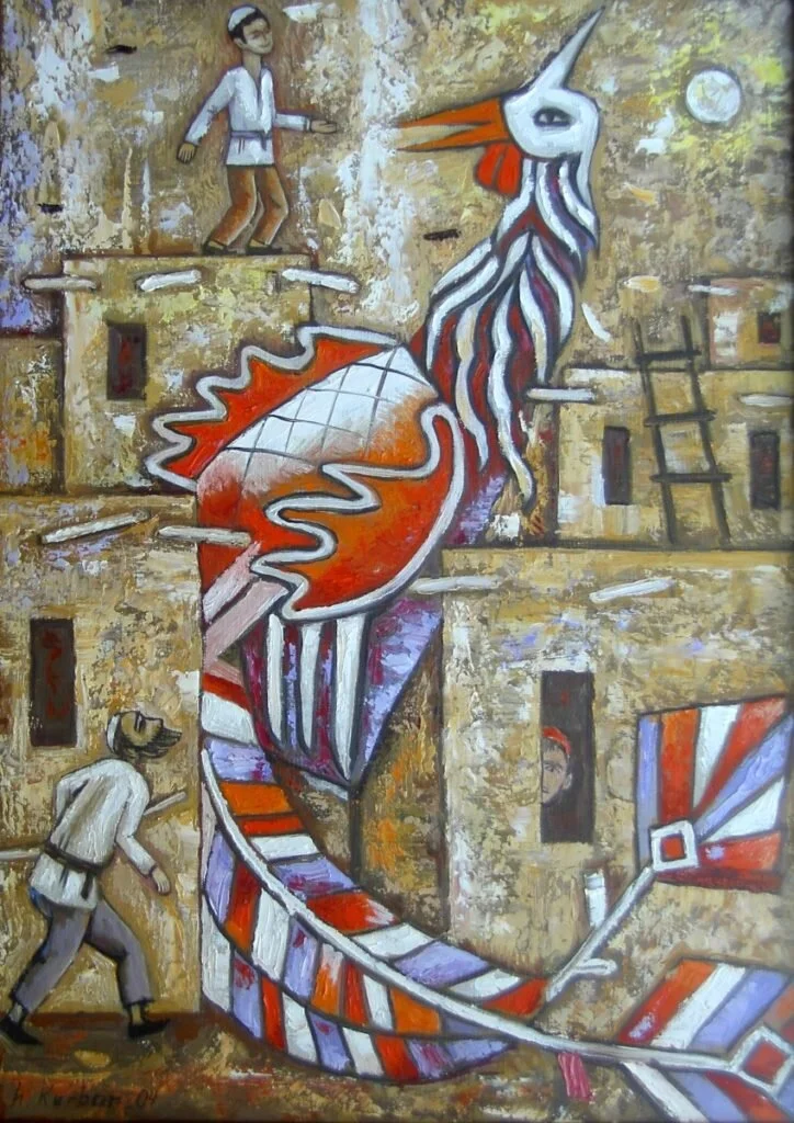 Khotan’s carpets depicting magnificent birds have become a symbol of this famous Silk Road city, and are known the world over. In this painting, I imagined how it all began. Large birds of all types—peacocks, roosters, and simurgs (the mythical bird of the East)—flew to Khotan many years ago. Fed by the children, everyone fell in love with them.