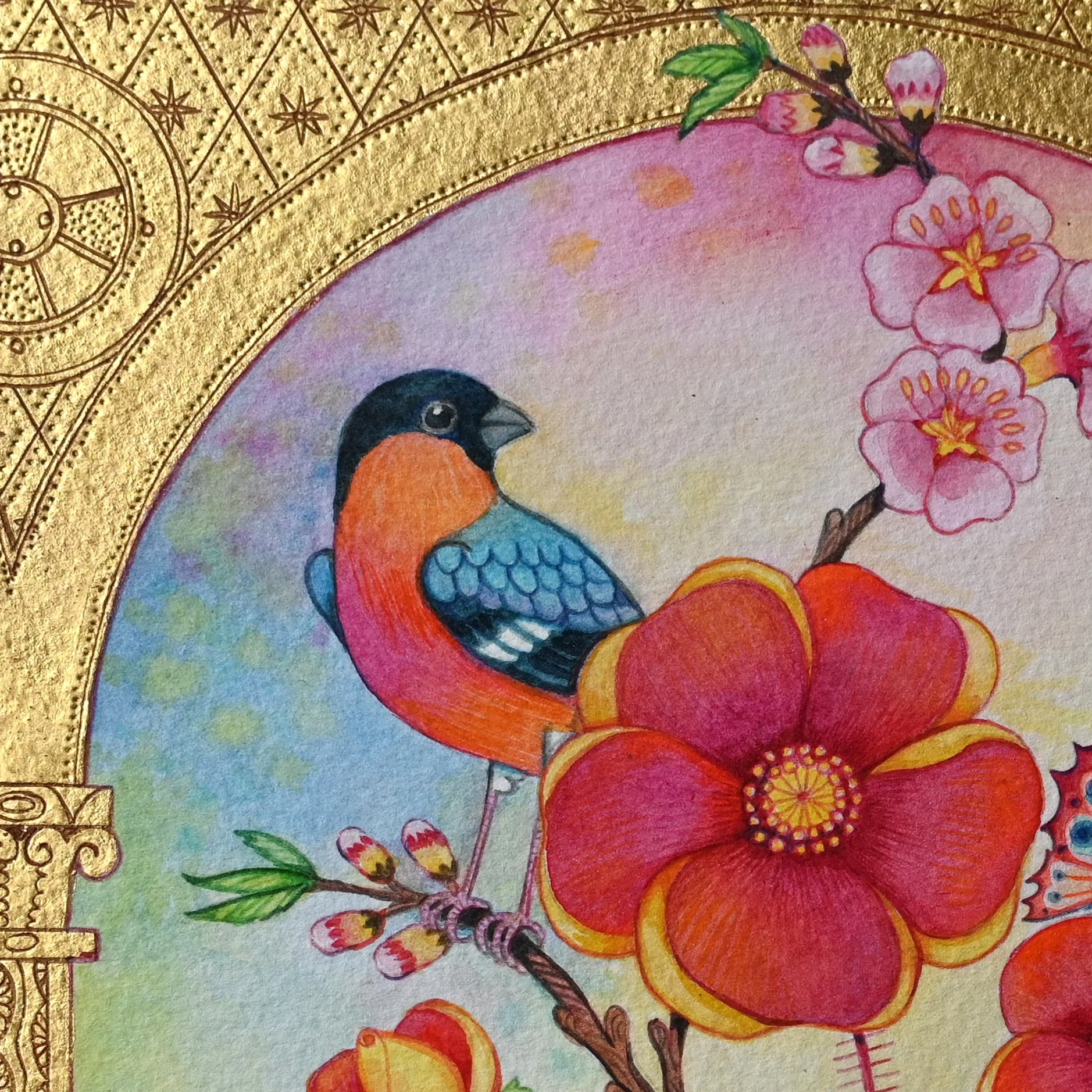 Part of a series inspired by the idea of an ancient garden that is still beautiful—here is found the Bullfinch. I think this image stems loosely from seeing Florence and the gardens of Fiesole in Italy some years ago. The memory was intensified by visiting Turkey’s Istanbul. The incredibly rich mix of culture there made a deep impression on me. The Byzantine arch and the calm symmetry of the architecture frame a slightly chaotic garden now run wild, amid the warm colors and scents of a Mediterranean summer.