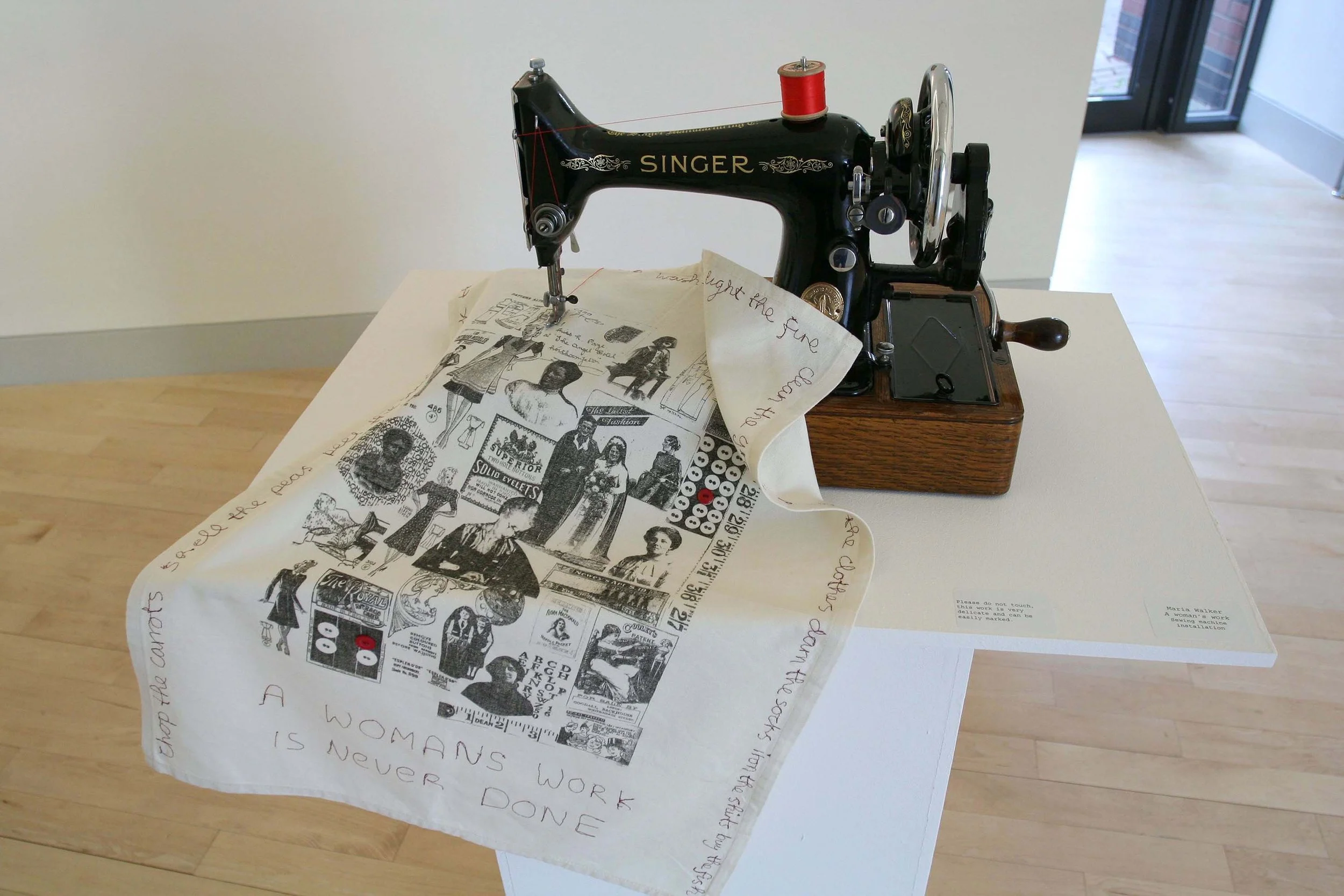 Printed & embroidered textile with old sewing machine, 80 x 40 x 20 cm, Private Collection