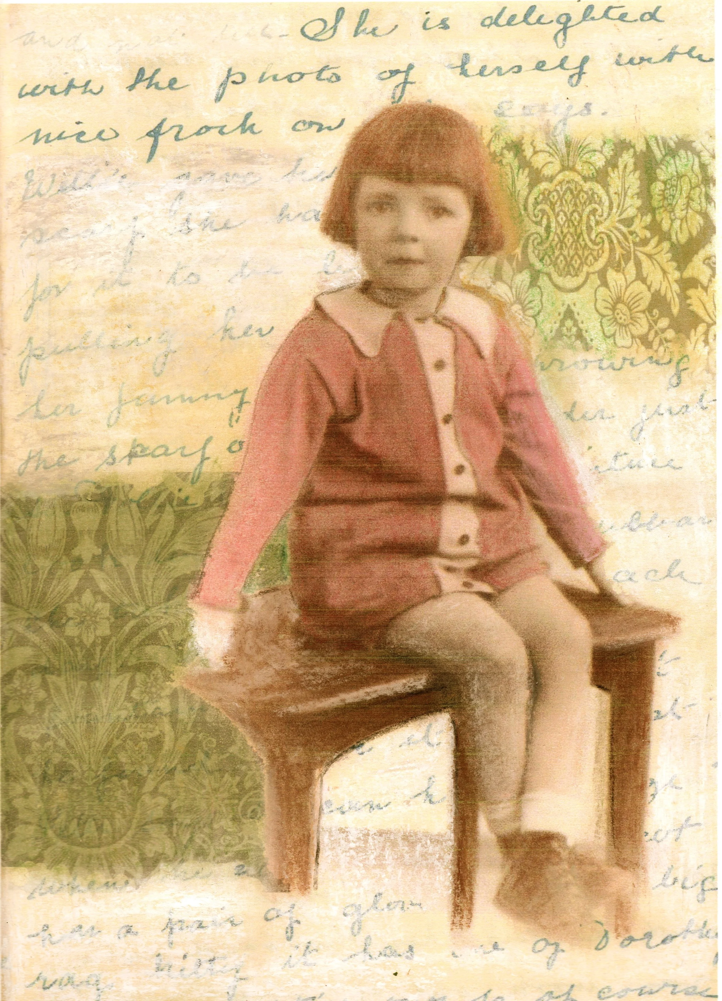 This work was created with Photoshop, building up digital layers using a photograph of my mother as a girl in the 1920’s and scans of the letters and backgrounds, some of which I printed out and coloured by hand.