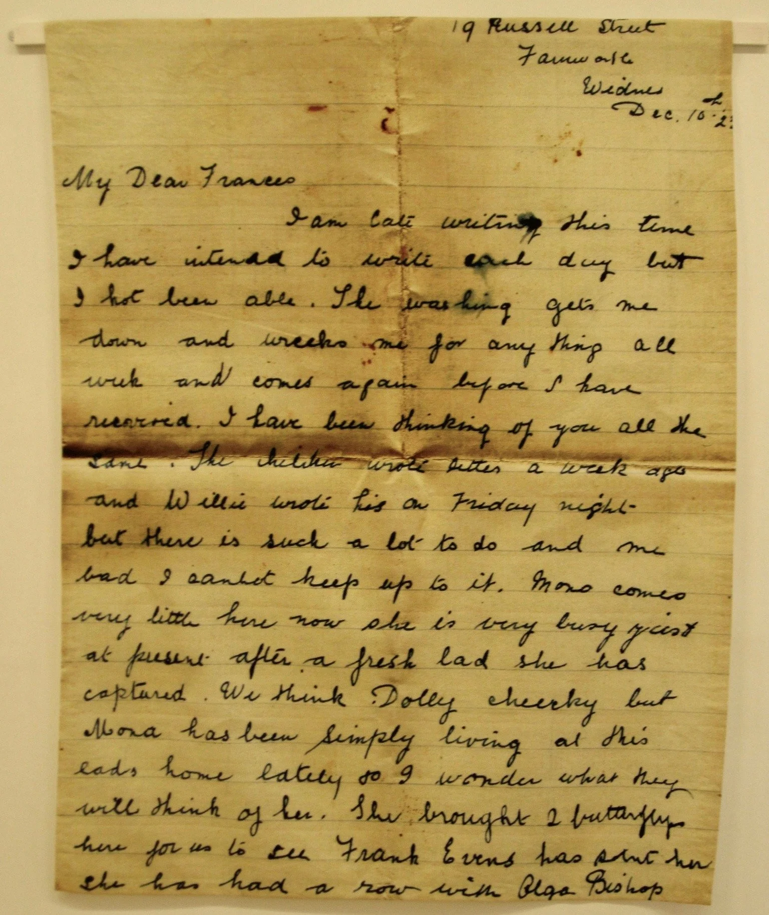 Ada Lightfoot really struggled with the family’s laundry. She was in poor health and arduous tasks made her asthma worse. In one of her letters she writes about her experience to daughter Frances. She describes how she washes on a Tuesday, and because the weather is so bad, the washing is then hung all around the house. It takes until Friday to be dry enough to iron. The soap she uses to clean her husband and eldest son’s dirty overalls is so harsh it makes her fingers bleed.