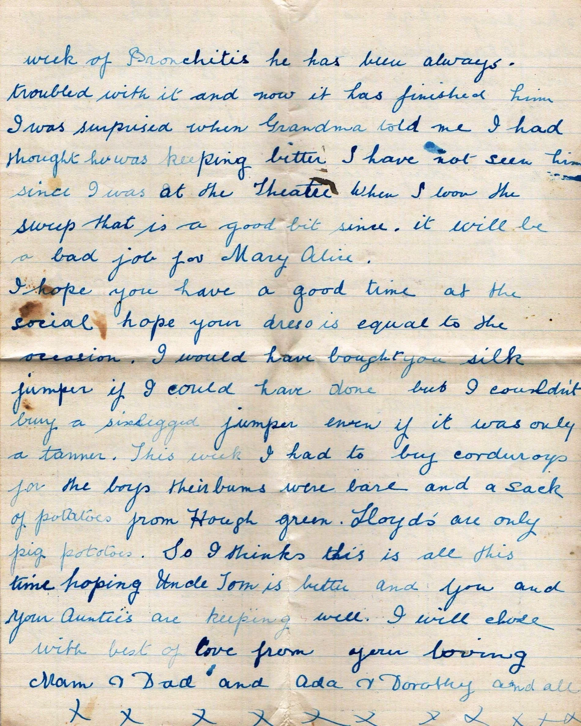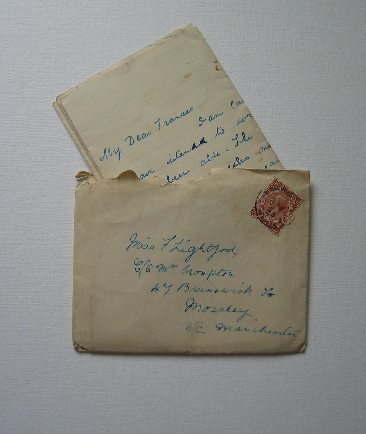 These letters were addressed to Frances, the eldest Lightfoot daughter who at the time was staying with her Aunt in Manchester, about 30 miles from the family home. Frances’s mother, Ada, kept her informed of all the local gossip, the antics of her younger brothers and sisters, and the ordeal of doing the washing and mending clothes. Other letters contained stories of trips to the dentist, ice skating on frozen ponds, Christmas parties at school, killing pigs, mending boots, and the general election.