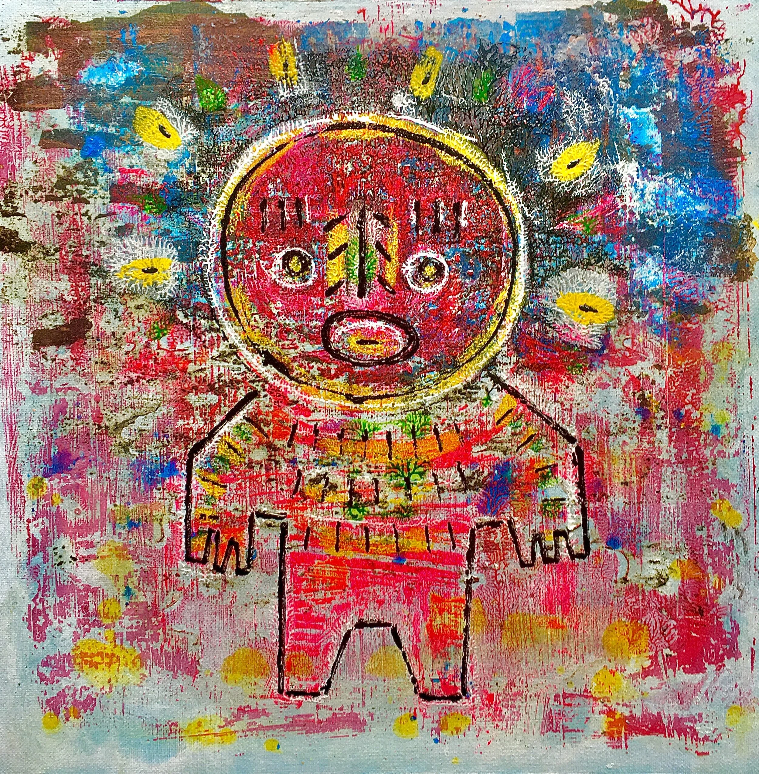 Inspired by a pre-Columbian clay figure, Boxi’s a sort of “everyman” reacting to the human condition’s many challenges in the whimsical street art, murals, paintings, and prints of UK-based artist Boxi Trixi.