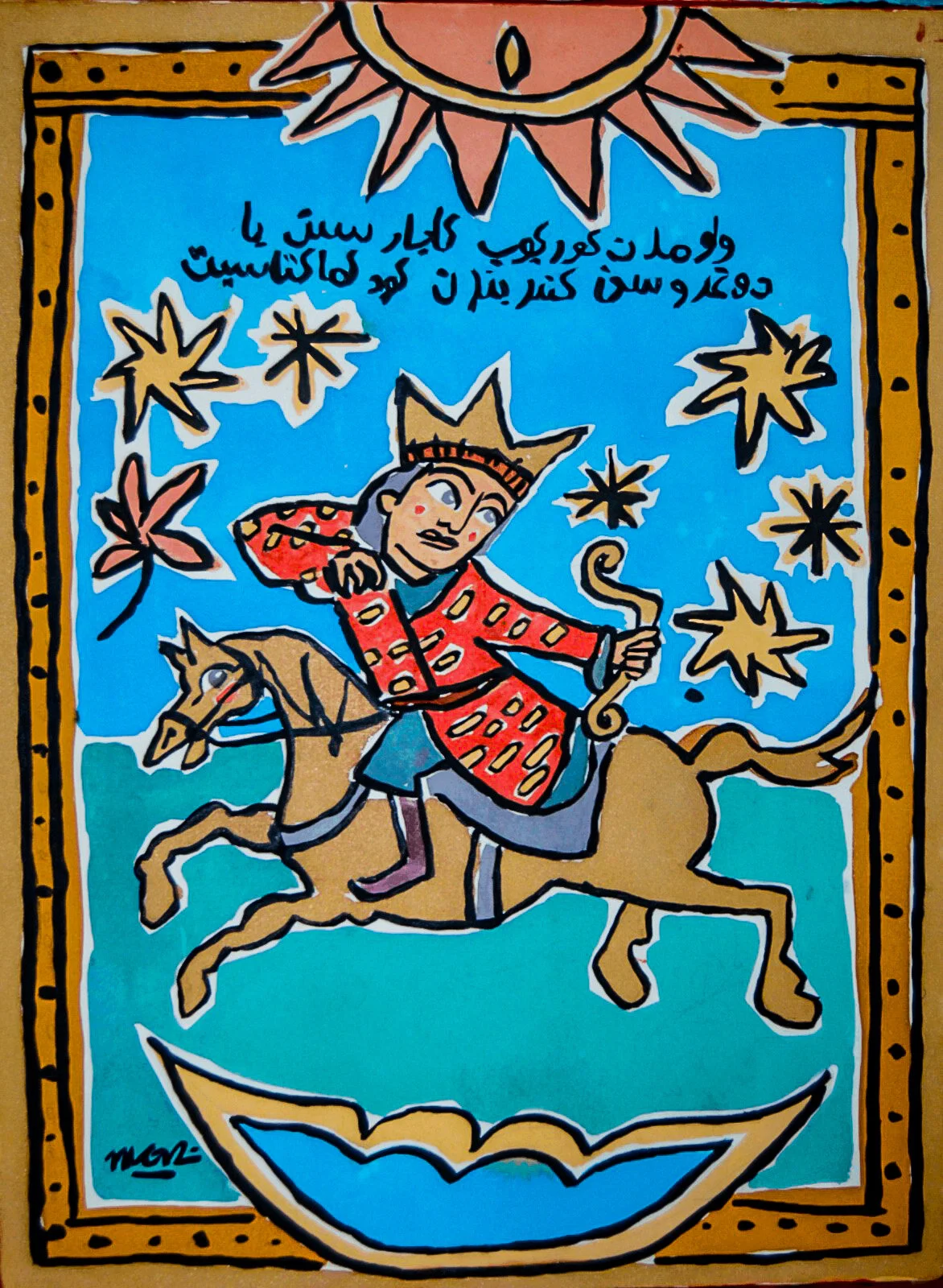 Turkish artist Ayhan Algur tranforms figures from ancient cultures that once inhabited Anatolia/Asia Minor—Seljuks, Greeks, Byzantines, Hittites, Lydians, and Ottomans—and places them within a tale from 1001 Nights.